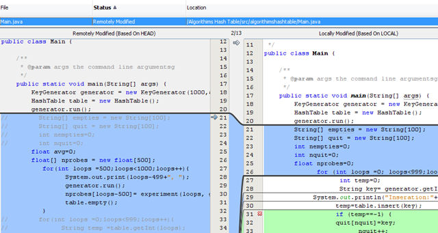 In the (Subversion) case above, the local copy is out of date (on the right) and the remote changes (on the left) are shown in blue. The changes were made on my laptop, committed and I’m comparing them against the desktop copy of the files.