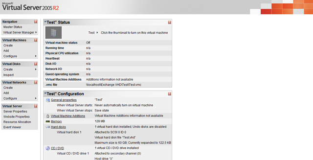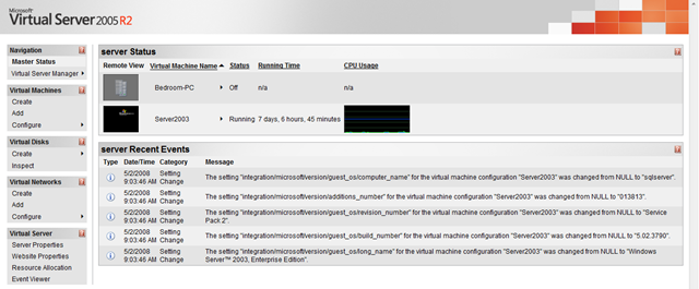 I’ve a 2.8Ghz Celeron D with 2GB RAM to run this on. Virtual Server can provision processor usage to an extent, but it uses RAM like there’s no tomorrow. Don’t forget that it has to play nicely with WHS (specifically DEmigrator.exe that burns CPU cycles) and other stuff like defrag passes and anti-virus.