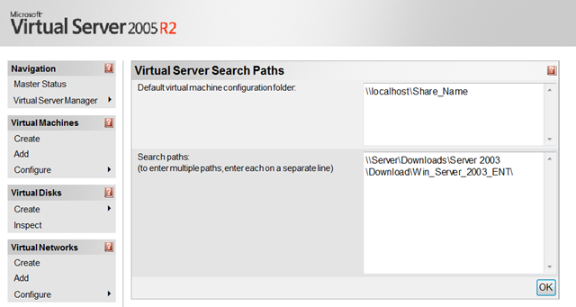 First we want to set the default location of our Virtual Machines. Go to Server Properties at the bottom of the Sidebar and click on Search Paths. Change the Default virtual machine configuration folder to your desired location. I’ve been using a network share with replication turned off.