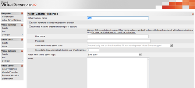 With my Windows Server 2003 VM running constantly, the WHS automatic restarts could be a problem. All I do is check the box, input the account details, set a delay ( in my case, 600 seconds) and tell Virtual server to save the VM’s state when WHS shuts down. The delay is actually a pretty nifty feature as it allows WHS to initialise itself, bringing all its processes online, before starting the VM.