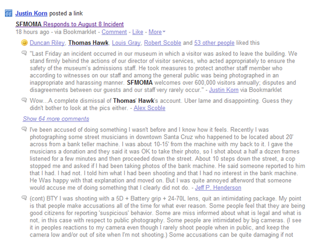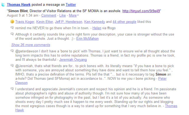 The first, and arguably most public, is the PR battle now erupting between Thomas Hawk (the photographer) and his supporters on the one side, and the San Francisco Museum of Modern Art on the other. In the middle there are a few moderates keeping a steady and cool head.