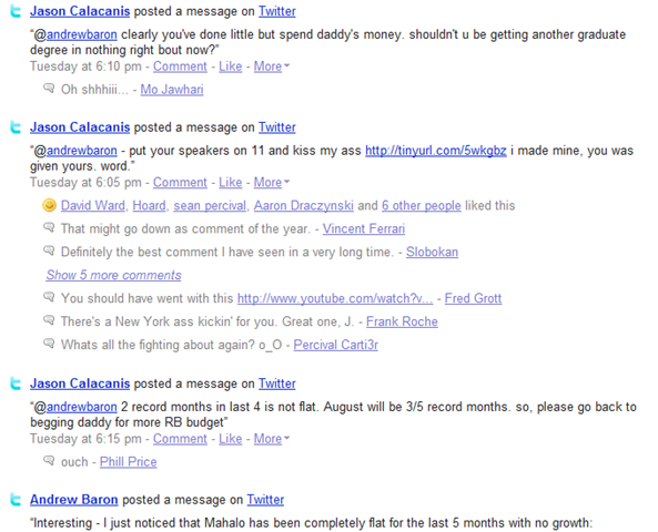 The other one, which I am less informed about is a solely a twitter affair. Usually Twitters popup in my feed entirely out of context. This time, however almost my entire page way covered in Twiters between Jason Calcanis of Mahalo and Andrew Baron.