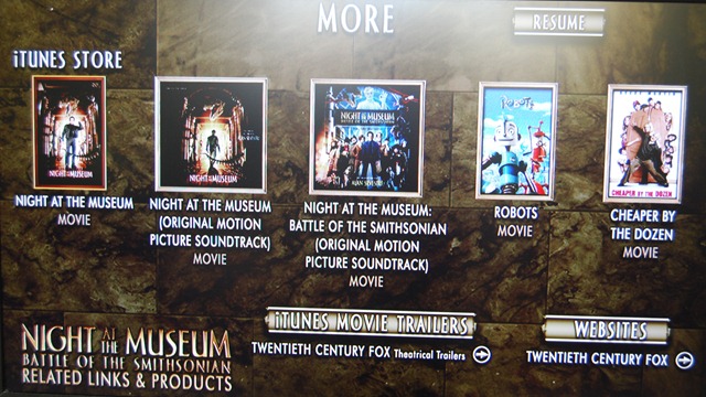 This is also interesting: a shameless attempt to sell us more stuff. A link to iTunes movie trailers and a link to Twentieth Century Fox. It would be cool if this were updated on a regular basis with other stuff. It would be a good place to put special offers. Such as 50% off the soundtrack because you bought the movie (so you have you buy the movie and get the soundtrack from this screen).